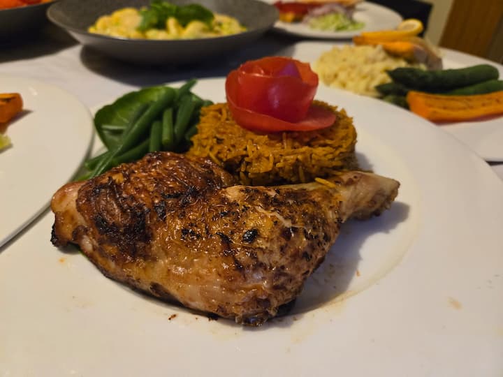 इस बोल्ड, कैरेबियन - प्रेरित क्लासिक भोजन में ब्रेज़्ड राइस और टमाटर सॉस के साथ एक मसालेदार चिकन लेग शामिल है।