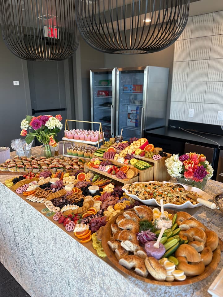हर तरह की सभाओं और समारोहों के लिए आदर्श, इस पेशकश में चारक्युटेरी और छोटे काटने का एक सुंदर प्रसार है।