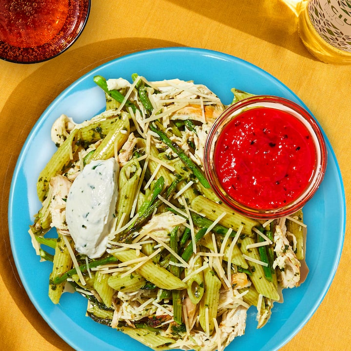 चिकन, शतावरी, भुनी हुई लाल मिर्च के साथ हर्बी पेस्टो पास्ता, सब कुछ मलाईदार रिकोटा के साथ। इसमें हर मेहमान के लिए 1 चिकन पेस्टो पास्ता मील शामिल है।