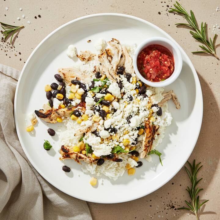 चावल, स्मोकी ब्लैक बीन्स, कॉर्न, कोटिजा और चिपोटल क्रेमा के साथ ब्रेज़्ड चिकन।