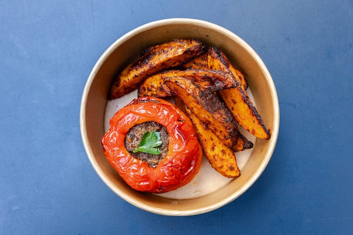 आपकी पसंद के प्रोटीन (चिकन, बीफ़ या शाकाहारी), भुनी हुई सब्ज़ियों और अनाज के साथ भूमध्यसागरीय स्वाद का मज़ा लेने के लिए तैयार एक कटोरा।