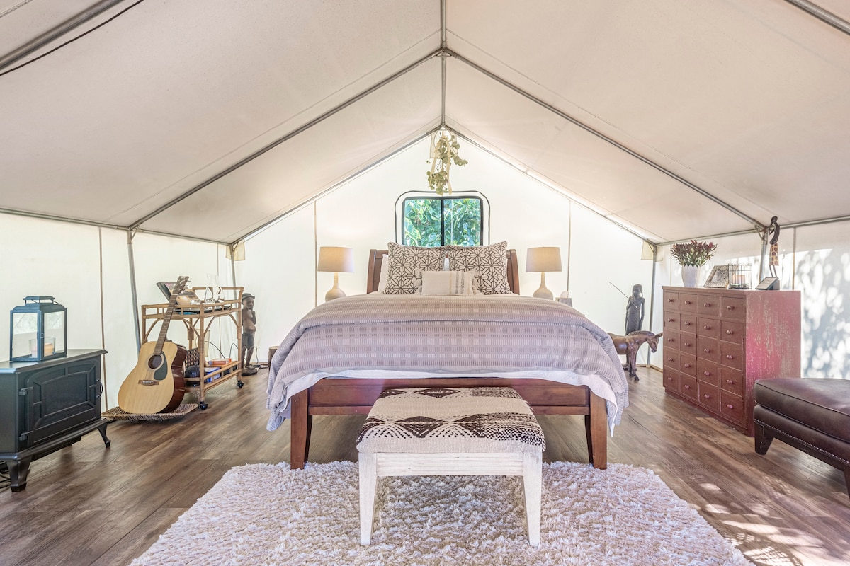 Indulge in an enchanting luxurious glamping experience with breathtaking views and a warm, bohemian ambiance. Enjoy the beautiful rustic shared outdoor space as the serene escape offers breathtaking views, abundant wildlife, and all modern amenities you need for a relaxing stay. Located only minutes away from forests, scenic hiking trails, beaches, wineries, restaurants & breweries. No AC or heater; Electric blanket provided for the queen bed. Fans are provided during summer days.