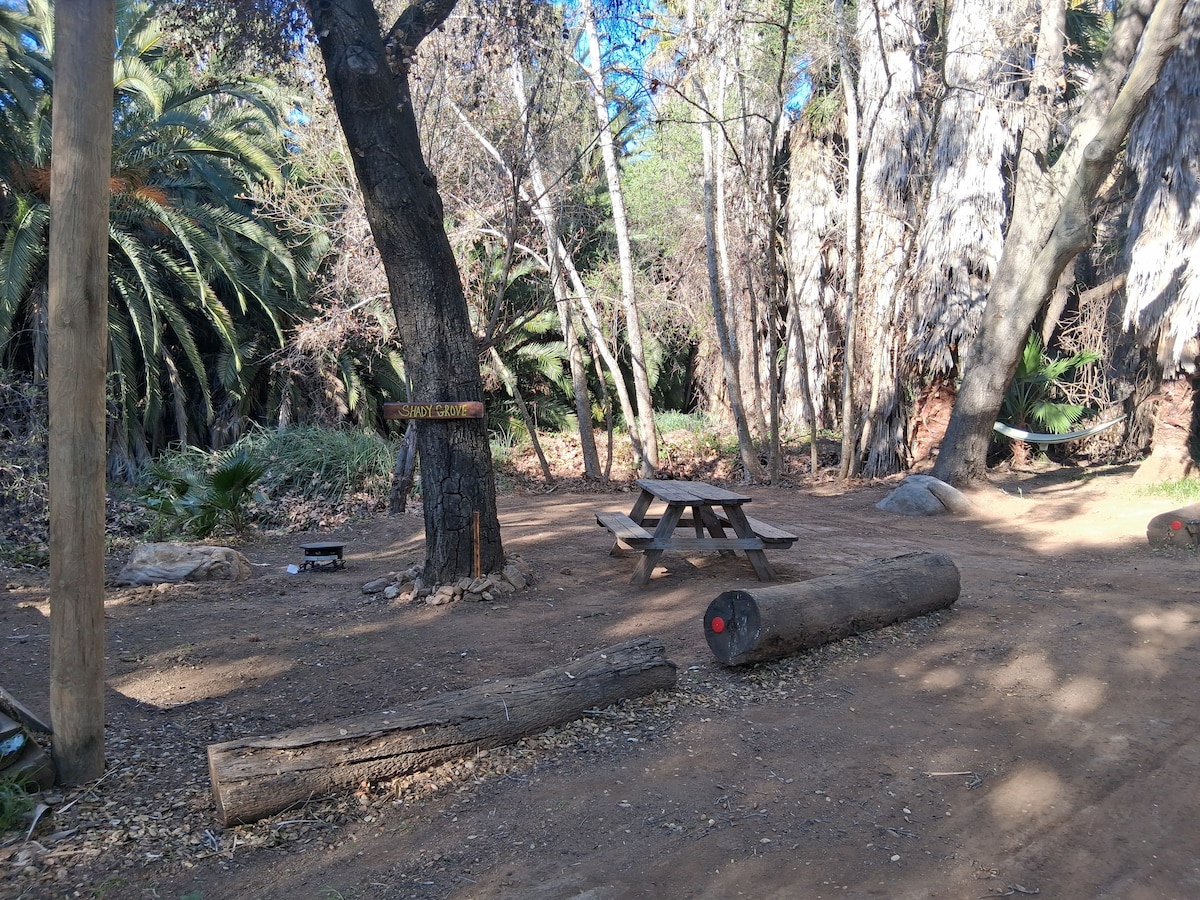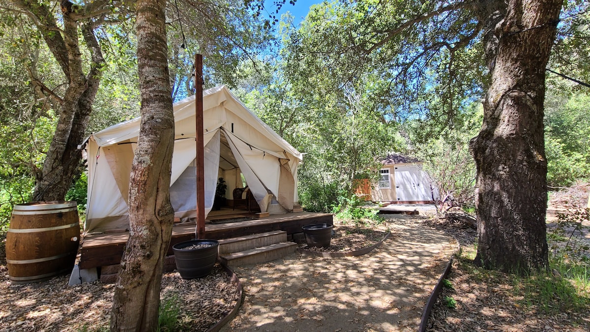 ओक के पेड़ों के एक ग्रोव के नीचे टकराया हुआ, और मंज़ानिता के पेड़ों से घिरा हुआ, "मंज़ानिता कोव" पर बैठा हुआ है। एक निजी ग्लैम्पिंग साइट जिसमें एक अद्भुत अनुभव के लिए आपकी ज़रूरत की हर चीज़ मौजूद है! हमने: पीने का पानी, बिजली के आउटलेट, प्रोपेन, फ़ायर पिट, मिनी फ़्रिज के साथ पूरा आउटडोर किचन, इनडोर और आउटडोर गर्म पानी की बौछार के साथ पूरा बाथरूम और बहुत कुछ दिया है। मुख्य घर "जूलियन रेड फॉक्स रिट्रीट" के साथ बुक करें, या रोमांटिक छुट्टियों के लिए अलग से बुक करें! लक्ज़री ग्लैम्पिंग का सबसे अच्छा अनुभव लें। तालाब सूखा हुआ है।