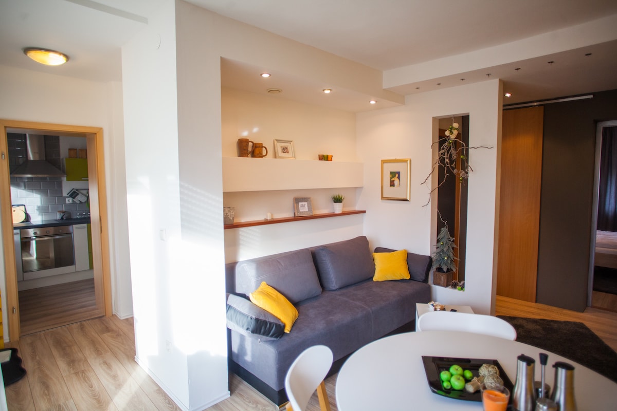 This apartment uses contrasts of dark furniture with bright pops of color to show off the contemporary designs found throughout. Feel your feet warm on the underfloor heating and refresh under the spacious rain shower.