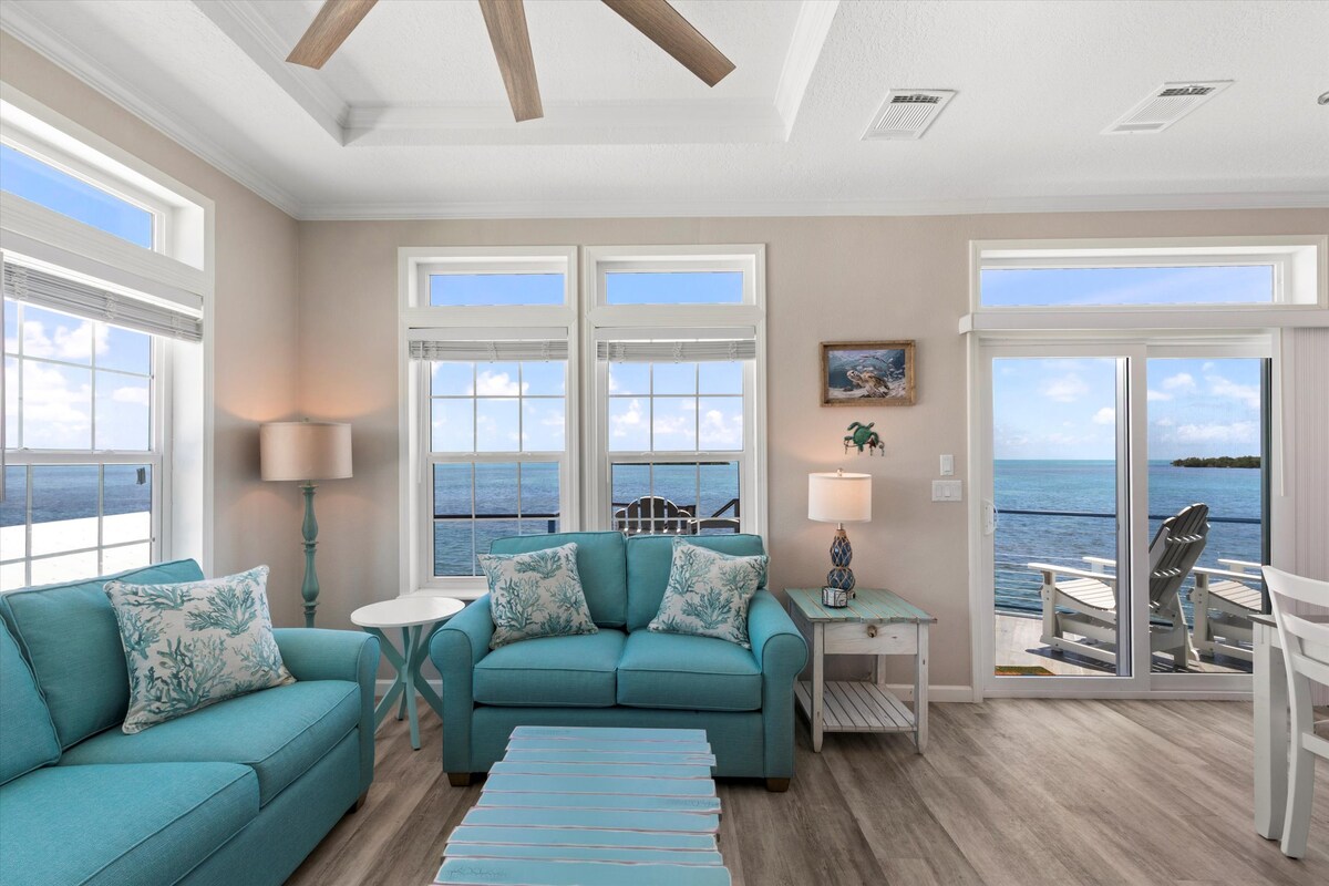 Updated waterfront 2BR/2BA with King Master, 2nd Queen and pullout couch. 35' seawall—bring your boat! Enjoy a fully stocked quartz kitchen with stainless appliances. Located in Venture Out, a quiet, family‑friendly gated resort with fishing, lobstering, pools, hot tub, pickleball, tennis, basketball, rec center, bikes, kayaks, and SUPs. Between Key West (20 mi) and Marathon. Free WiFi; Roku TVs in both bedrooms and living room. Kayaks, SUPs and storage area with extra fridge and bait freezer.