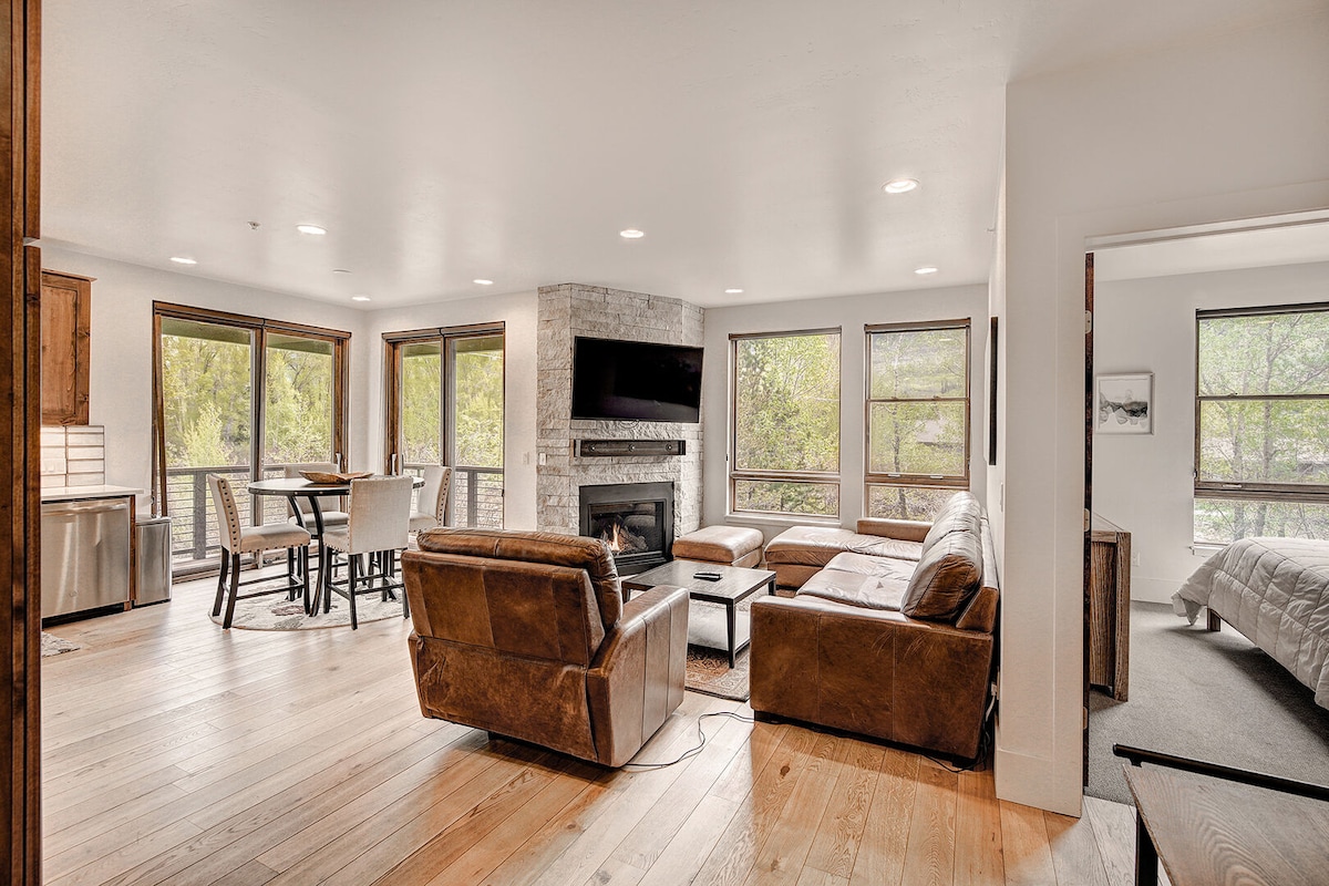 इस 3BR 2 1/2BA में समूह/पारिवारिक बातचीत की सुविधा देने वाला एक खुला लेआउट है। रहने वाले क्षेत्र से, ग्लास दरवाजे गर्म टब के साथ डेक तक खुले हैं। डेक और लिविंग एरिया से, सर्दियों में पहाड़ों के नज़ारे प्रबल होते हैं और गर्मियों में विशाल एस्पेन छाया प्रदान करते हैं। लिविंग एरिया से ऊपर एक मास्टर सुइट है और दो बेडरूम प्रवेश स्तर से ठीक नीचे स्थित हैं। हॉट टब को सपोर्ट करने वाला बैक डेक मुख्य लिविंग एरिया के ठीक बाहर मुख्य स्तर पर है।