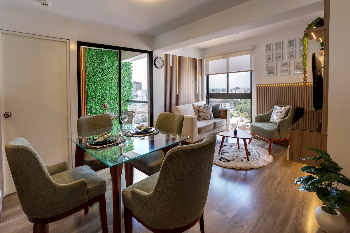 Disfruta tu estad├нa en este dpto. de estreno en el piso 17, ubicado en el coraz├│n de San Isidro, una de las zonas m├бs exclusivas y seguras de Lima. Detalles: - 1 dorm con cama c├│moda y cl├│set amplio - sala luminosa con vista maravillosa - cocina completa - ba├▒o moderno de estreno - wifi y espacio ideal para HO - ubicaci├│n estrategia cerca a todo (centro empresarial, caf├йs, parques, supermercados y restaurantes) - ideal para estancias largas