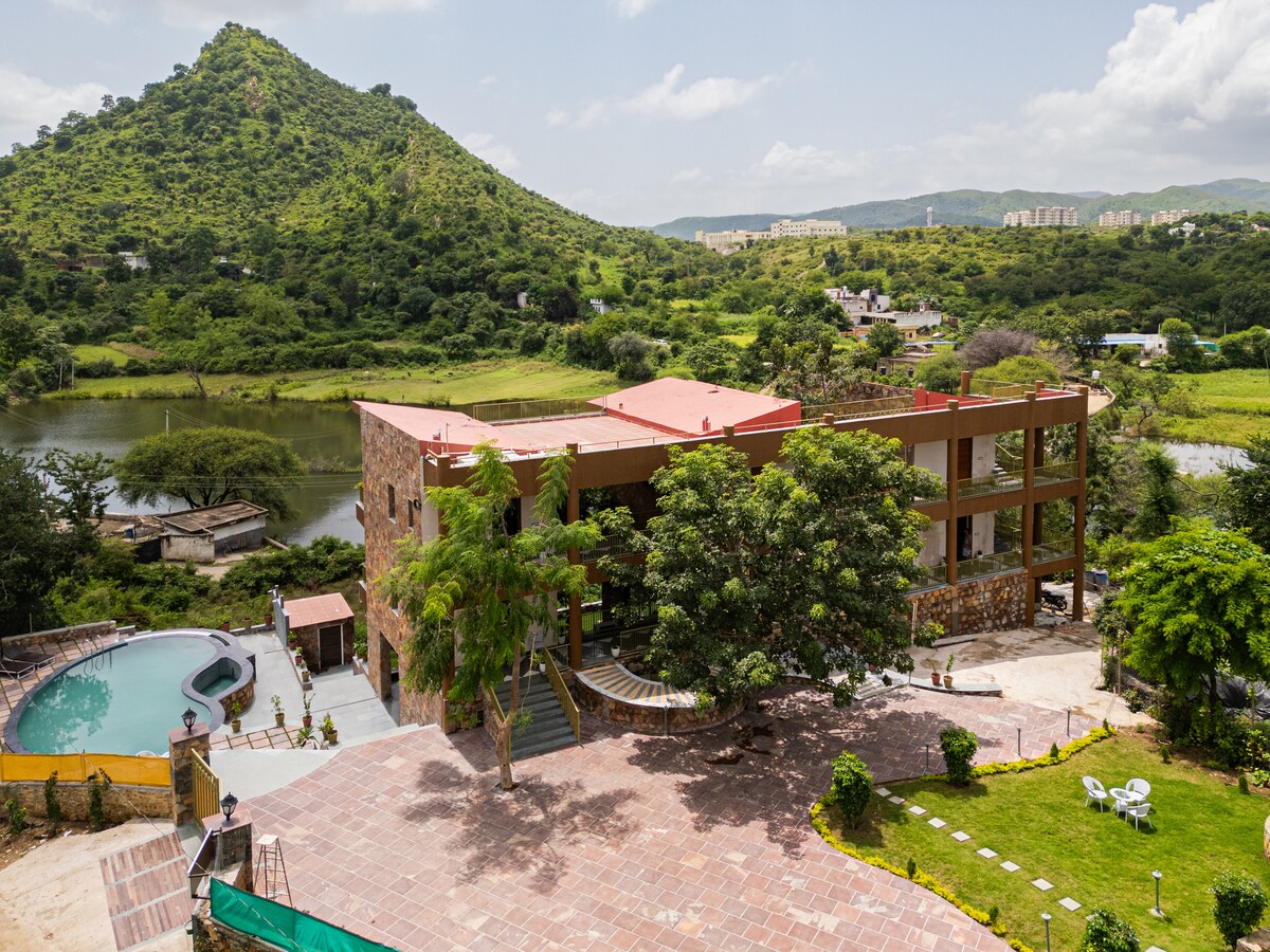 рдЙрджрдпрдкреБрд░ рдХреЗ рдкрд╛рд╕ рдореМрдЬреВрдж рд╣рдорд╛рд░реЗ рд╢рд╛рдВрддрд┐рдкреВрд░реНрдг рдиреЗрдЪрд░ рд╡рд┐рд▓рд╛ рдореЗрдВ рдЖрдкрдХрд╛ рд╕реНрд╡рд╛рдЧрдд рд╣реИ, рдЬреЛ рдкрд╣рд╛рдбрд╝реЛрдВ рдФрд░ рд╣рд░рд┐рдпрд╛рд▓реА рд╕реЗ рдШрд┐рд░рд╛ рд╣реБрдЖ рд╣реИред рдЗрд╕ рдкреНрд░реЙрдкрд░реНрдЯреА рдореЗрдВ рдПрдХ рд▓рдХреНрдЬрд╝рд░реА рдХрдорд░рд╛ рд╣реИ, рдЬрд┐рд╕рдореЗрдВ рд╕реЗ рдкреВрд▓ рддрдХ рд╕реАрдзреЗ рдкрд╣реБрдБрдЪрд╛ рдЬрд╛ рд╕рдХрддрд╛ рд╣реИ рдФрд░ рджреЛ рдЖрдЙрдЯрдбреЛрд░ рдХреИрдореНрдкрд┐рдВрдЧ рдЯреЗрдВрдЯ рднреА рд╣реИрдВред рдореЗрд╣рдорд╛рди рдЧрд╛рдБрд╡ рдЬреИрд╕реЗ рд╢рд╛рдВрдд рдорд╛рд╣реМрд▓ рдореЗрдВ рдкреВрд▓ рдХреЗ рдЦреВрдмрд╕реВрд░рдд рдирдЬрд╝рд╛рд░реЛрдВ, рд╕реВрд░реНрдпрд╛рд╕реНрдд рдХреЗ рдордирдореЛрд╣рдХ рдирдЬрд╝рд╛рд░реЛрдВ, рддрд╛рдЬрд╝рд╛ рд╣рд╡рд╛ рдФрд░ рдкрдХреНрд╖рд┐рдпреЛрдВ рдХреА рд╕реБрдХреВрдирджреЗрд╣ рдЖрд╡рд╛рдЬрд╝ рдХрд╛ рдордЬрд╝рд╛ рд▓реЗ рд╕рдХрддреЗ рд╣реИрдВред рдпрд╣ рдЬрдЧрд╣ рдХрдкрд▓, рдХреБрджрд░рдд рд╕реЗ рдкреНрдпрд╛рд░ рдХрд░рдиреЗ рд╡рд╛рд▓реЛрдВ, рдЕрдХреЗрд▓реЗ рдпрд╛рддреНрд░рд┐рдпреЛрдВ рдФрд░ рдХреБрджрд░рдд рдХреЗ рдХрд░реАрдм рдПрдХ рд╢рд╛рдВрдд рдФрд░ рдирд┐рдЬреА рдард╣рд░рдиреЗ рдХреА рдЬрдЧрд╣ рддрд▓рд╛рд╢ рд░рд╣реЗ рдЕрдВрддрд░рд░рд╛рд╖реНрдЯреНрд░реАрдп рдореЗрд╣рдорд╛рдиреЛрдВ рдХреЗ рд▓рд┐рдП рдмрд┐рд▓реНрдХреБрд▓ рд╕рд╣реА рд╣реИред