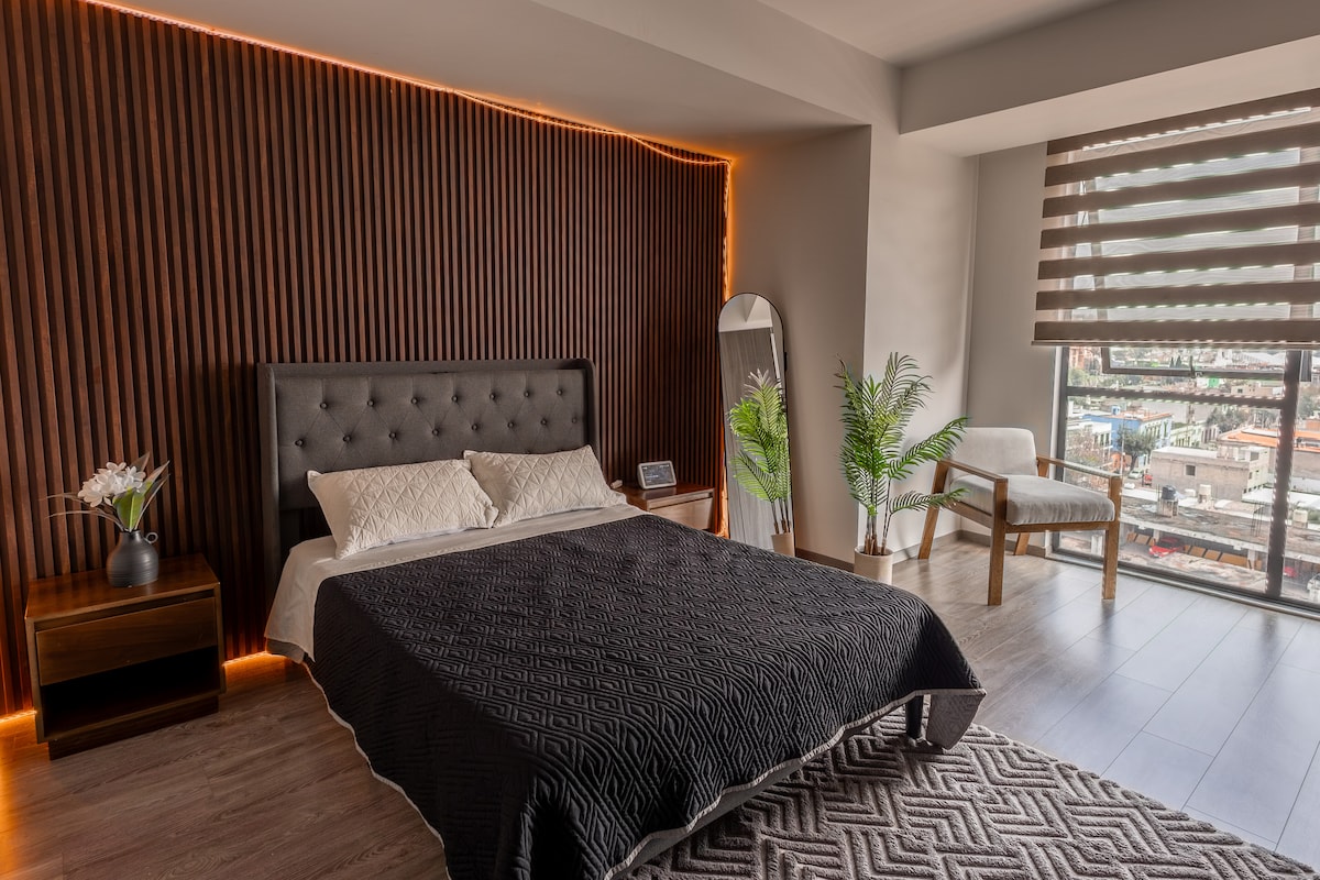 En el Centro Histórico de Toluca en Plaza Paseo Molino. Despierta con vistas panorámicas a la Catedral y Portales, a solo unos pasos de la Alameda, Cosmovitral y Teatro Morelos. En el mismo edificio encontrarás todo: Starbucks, restaurantes, cine, Smart Fit, más, accesibles solo con tomar el elevador. Ofrece recepción y videovigilancia 24/7, wifi de alta velocidad, estacionamiento privado, para que trabajes, descanses o disfrutes de una escapada romántica con total tranquilidad.