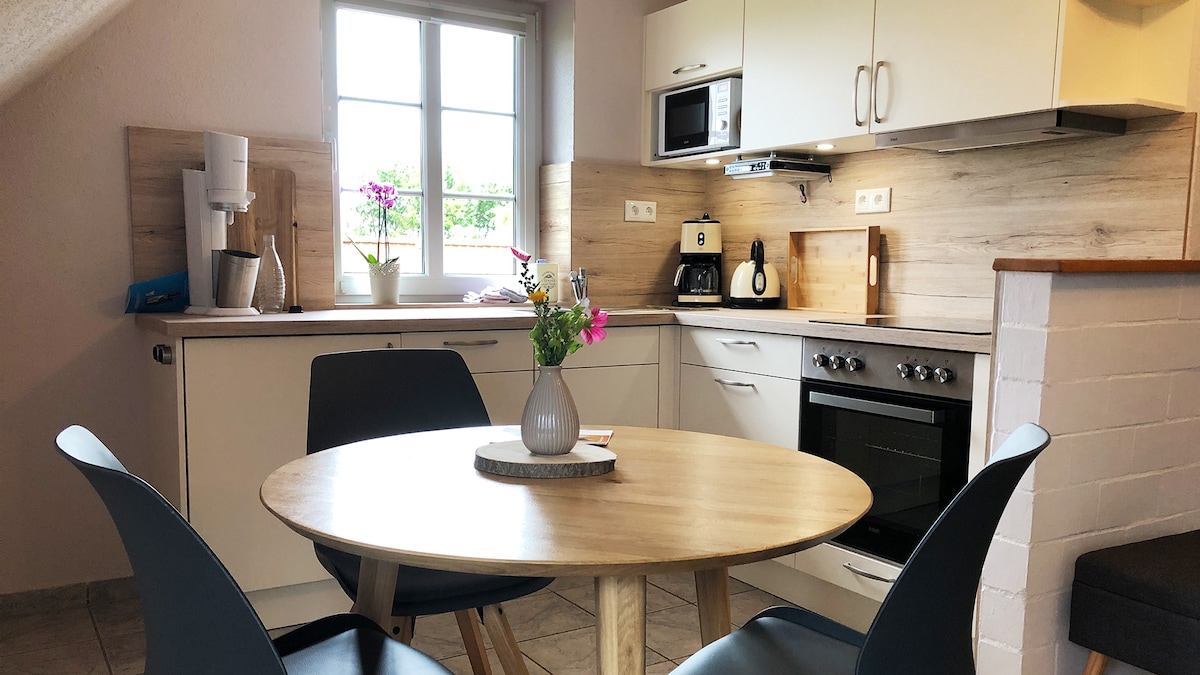हमारा "बड़ा" अपार्टमेंट 85 वर्गमीटर में फैला हुआ है, जो फ़्रेडरिक वॉन एस्मार्च के जन्मस्थान की दूसरी मंज़िल पर स्थित है। अपार्टमेंट का दिल खुला, रसोई और बैठने की जगह है, जिस पर आप विशाल लिविंग रूम में जाते हैं। प्रवेश द्वार दालान छोटे बेडरूम की ओर जाता है। मुख्य विंग शॉवर रूम को डबल सिंक और रेन शावर से बड़े बेडरूम से जोड़ता है। पूरा अपार्टमेंट सफ़ेद प्लैंक फ़्लोर से सुसज्जित है। तो: मज़े करें!!