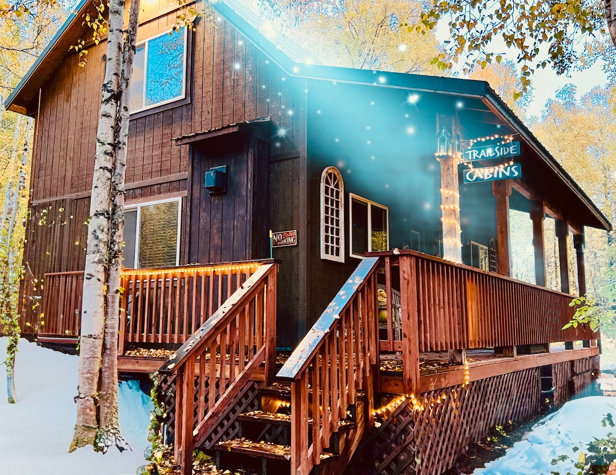 पार्क हाईवे तक आसानी से पहुँचने और डेनाली ब्रूइंग कंपनी के लिए बस थोड़ी पैदल दूरी पर स्थित एक आरामदायक, शांत फ़्रेम केबिन! मेहमान पूरी तरह से सुसज्जित किचन, पूरे बाथरूम, निजी डेक, गैस ग्रिल, वॉशर/ड्रायर और बहुत कुछ का आनंद ले सकते हैं! डेनाली नेशनल पार्क से/अपने रास्ते में आने वाले यात्रियों के लिए एक शांतिपूर्ण सप्ताहांत की छुट्टियों या अच्छी रातों की नींद के लिए बिल्कुल सही।