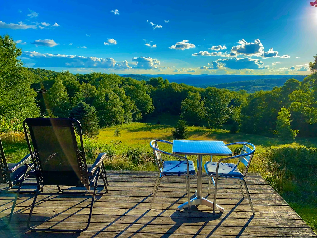 Romantic Mountain Top Retreat with Million Dollar Views Escape to this incredibly private, mountaintop vacation home, nestled on 80 acres of pristine land. Offering breathtaking, panoramic views. This peaceful retreat is the perfect getaway for relaxation and romance. Just 2 hours from the GW Bridge, enjoy the tranquility of nature without sacrificing modern comforts, including high-speed internet service. The ideal escape for those seeking both privacy and convenience.