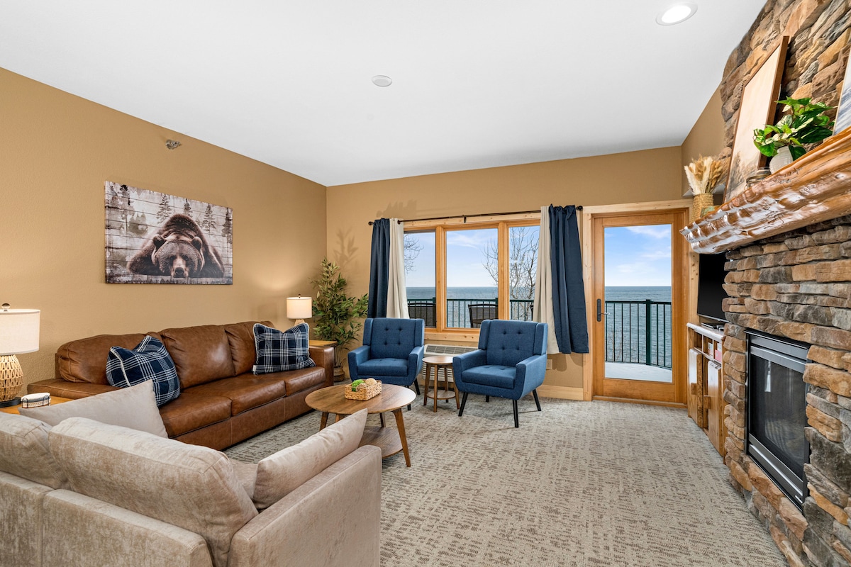 Located on the East wing of Chateau LeVeaux Resort, this condo has been remodeled and features an open concept kitchen and beautifully refaced stone fireplace. Enjoy the sights and sounds of Lake Superior from your private patio. Spend the day hiking, skiing, snowmobiling, playing golf, or relaxing to some of the finest music at one of the many nearby restaurants, and then come back to Chateau to enjoy the pool, sauna, hot tub, firepits, or game room.