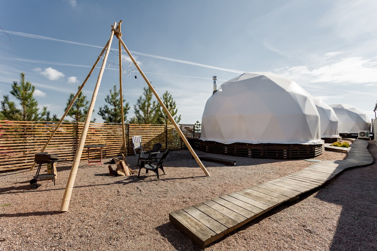 हम काम करते हैं! हम काम कर रहे हैं! हमारे राउंड ईयर - राउंड ग्लैम्पिंग में तीन गुंबद हैं: पारिवारिक बड़े गुंबद (40 वर्ग मीटर, 1 -3 मेहमानों के लिए) और एक छोटा रोमांटिक गुंबद (30 वर्ग मीटर, 1 -2 मेहमानों के लिए)। ग्लैम्पिंग एक होटल के कमरे या मिनी कॉटेज के सभी आरामों के साथ प्रकृति में बाहर खाने का एक तरीका है। प्रत्येक गुंबद दोनों महत्वपूर्ण सुविधाओं (सभी सौंदर्य प्रसाधनों और तौलिए के साथ एक बाथरूम, व्यंजनों के साथ एक रसोई) और सुखद विवरण (एक मैच बनाने के लिए एक सेट या चाय समारोह के लिए सब कुछ) से भरा हुआ है।
