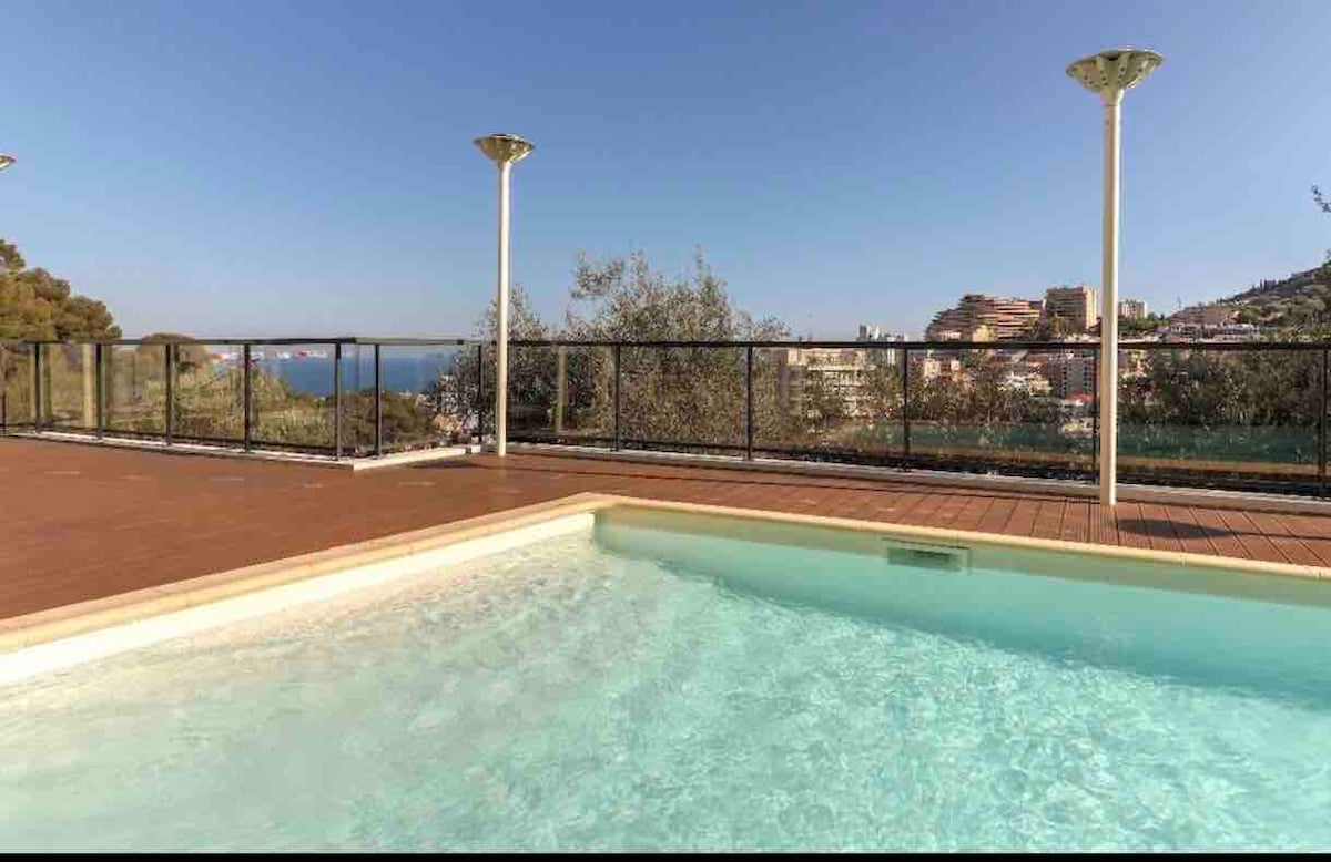 मोनाको के पास मनोरम समुद्र का दृश्य। पूल + छत