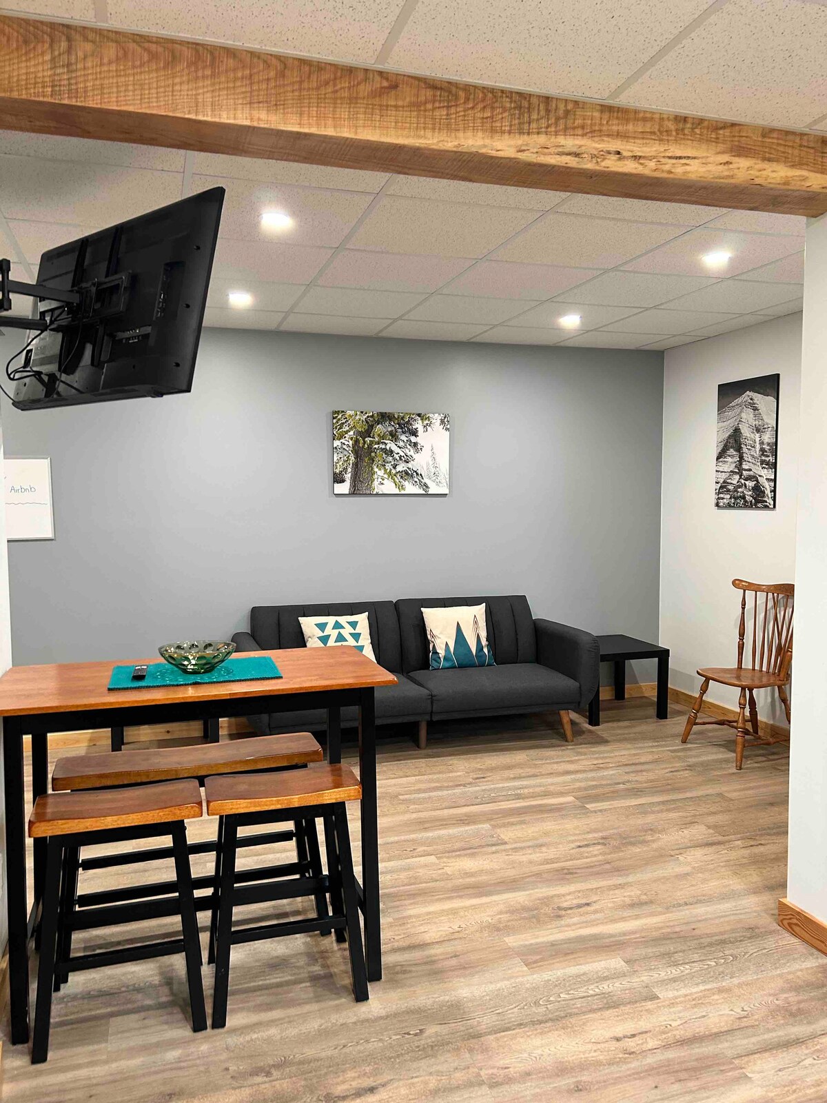 लकड़ी के फ्रेम घर में आधुनिक तहखाने सुइट। क्वीन बेड, अलमारी और डेस्क वाला एक बेडरूम। एकल या जोड़ों के लिए बिल्कुल सही। किचन में माइक्रोवेव, मिनी फ़्रिज, हॉट प्लेट, टोस्टर, केतली और कॉफ़ी मेकर शामिल हैं। एक पब शैली की मेज चार सीटें। वाईफ़ाई और स्मार्ट टीवी शामिल हैं। इस आरामदायक सुइट का अपना निजी प्रवेश द्वार और दो बड़ी खिड़कियां हैं, जो बहुत सारी प्राकृतिक सूरज की रोशनी देती हैं। Valemount की पेशकश करने वाले सभी का आनंद लें! हम आप होने के लिए तत्पर हैं!