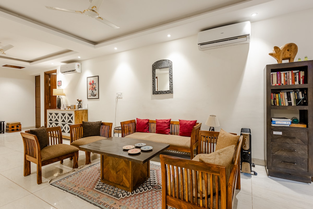 Attention: In peak season, place is booked very quickly! Experience unparalleled luxury in this exquisite South Delhi 3-bedroom floor in a house, in exclusive and gated Sainik Farms, located close to malls and Saket Metro Station. Bespoke Statuario Italian marble floors, hand-crafted furniture & spacious bedrooms with private balconies. Unwind in spa-like bathrooms with bathtubs, AI-based climate control, a fully equipped modular kitchen, and serene outdoor space.