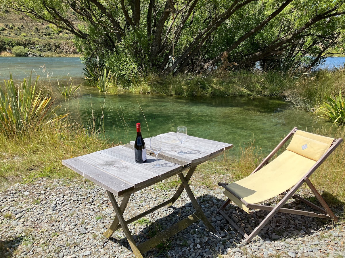 Funky retro off grid tiny house. Lovely handmade wooden interior, Large sunny porch, bar, cosy, Solar lanterns Bubbling stream flowing by. Forest views. Loft double bed & 1 single. Not suited for giants! Separate bathroom/shower short walk away. Amazing meals & local Waitaki wines Book the woodfired Hot tub set in circle of trees, great star gazing. Have a detox sauna. Guided fishing Guests say how peaceful & relaxing it is & great stargazing. Farm pets. WiFi @main Lodge on request.