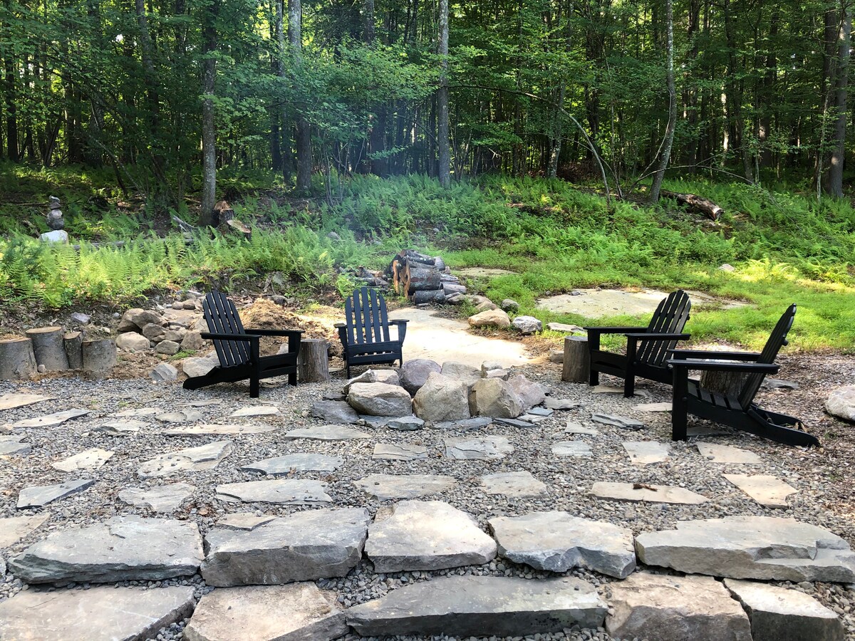 इस बिल्कुल नए, केंद्रीय रूप से स्थित पलायन में इससे दूर रहें! शांत जंगल से घिरी एक निजी सेटिंग में स्थित, आप दुनिया से अलग महसूस करेंगे, फिर भी Rt. 209 से केवल आधा मील दूर। 10 मिनट में आप झील Minnewaska के आसपास लंबी पैदल यात्रा कर सकते हैं या स्टोन रिज के अनोखे शहर के माध्यम से टहल सकते हैं। न्यू Paltz में ठीक भोजन और किंग्स्टन में खरीदारी केवल 25 मिनट दूर है। यह सब या घर पर आराम करें और शेफ की रसोई, गुंबददार छत, गर्म टब और फायरपिट का आनंद लें।