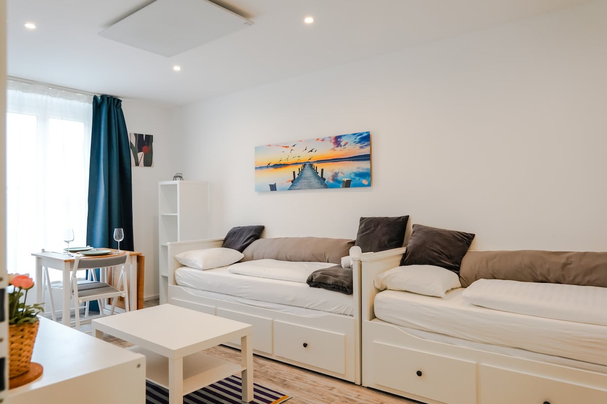 Willkommen in unserem Studio im Zentrum von Wiener Neustadt, nur wenige Gehminuten entfernt vom Dom, der charmanten Altstadt, dem Landesklinikum und dem City Campus der Fachhochschule. Die 50m² große Unterkunft bietet einen Balkon, der zum ruhigen Innenhof ausgerichtet ist, die stilvolle Einrichtung und der selbständige Check-in macht deinen Aufenthalt besonders angenehm. Das Studio ist ideal für 2 Personen, eine hochwertige Ausziehcouch (2m x 1,4m) bietet jedoch auch Platz für bis zu 4 Gäste.