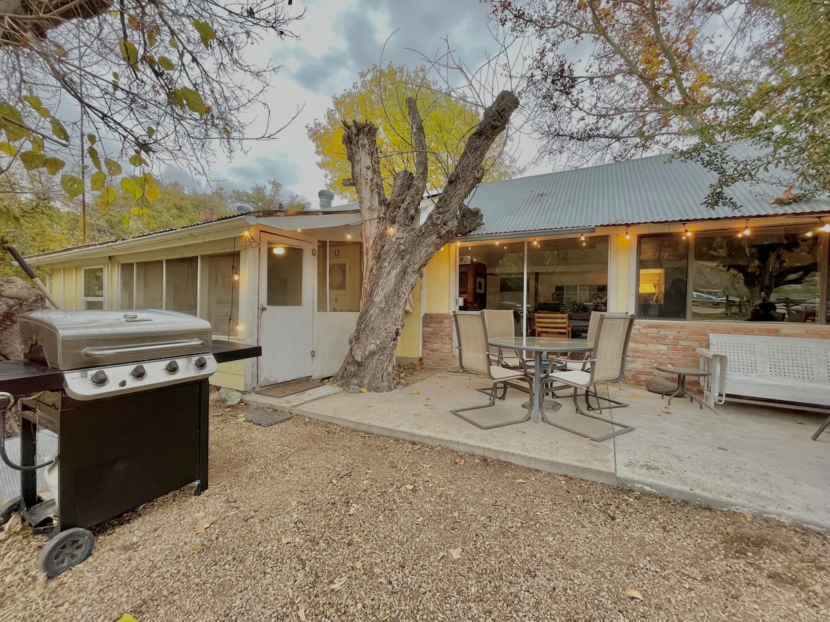 यह 950 वर्ग फ़ुट का बंगला - नए सिरे से रेनोवेट किया गया है - जिसे हमारे खूबसूरत, शांतिपूर्ण रैंच/घास के मैदान में बनाया गया है। यह पूरी तरह से रसोई/भोजन क्षेत्र के साथ आत्म - खानपान के लिए सुसज्जित है। विशाल ओपन - स्पेस शैली (फ़ोटो देखें), बड़े पोर्च, एक सुंदर पूल, हॉट टब, मुर्गियों के साथ खलिहान, मिनी गधे और 2 लामा, और हमारे दो प्यारे गोल्डन रिट्रीवर्स के साथ। हम अपनी सभी सुविधाओं के साथ डाउनटाउन प्रेस्कॉट से केवल 25 मिनट की दूरी पर हैं, और फिर स्कल वैली के शांत और अद्भुत तारों वाले आसमान में घर वापस आ गए हैं।