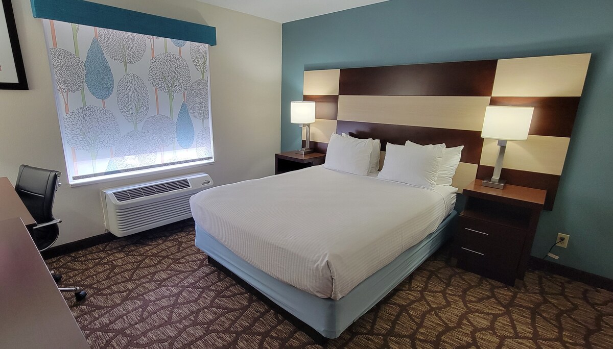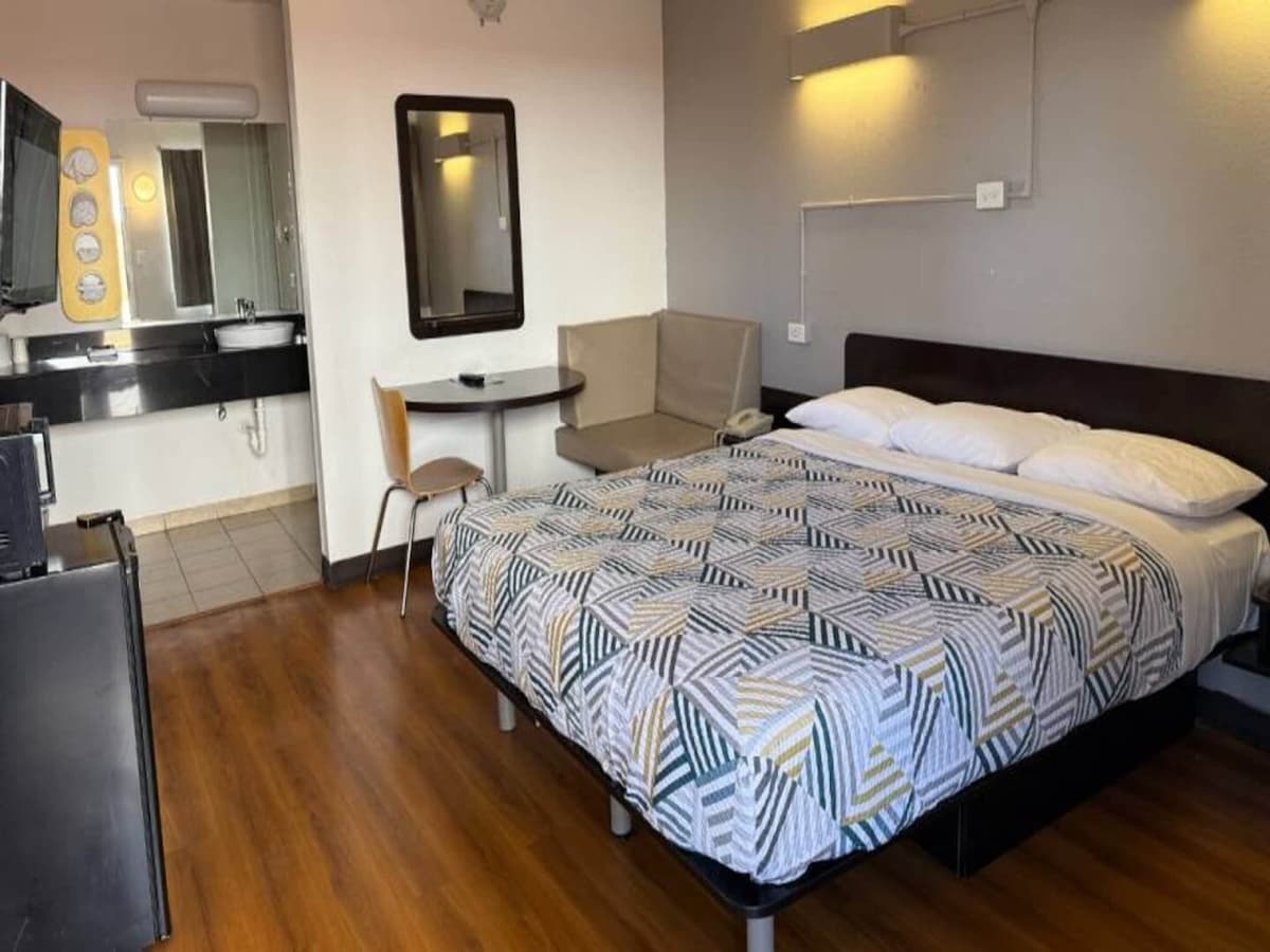 The Cozy King Bed Room offers a relaxing stay with a plush double bed, bathtub, flat-screen TV, free WiFi, and climate control. Guests enjoy 24-hour front desk service, daily housekeeping, vending machines, and laundry facilities. Nearby spots include Lil Deb’s Express Eats, Louie’s Waffle House, Joliet Metra and Amtrak stations, Four Lakes Rope Tow, and Lewis University and Dupage airports—making this a convenient home away from home.
