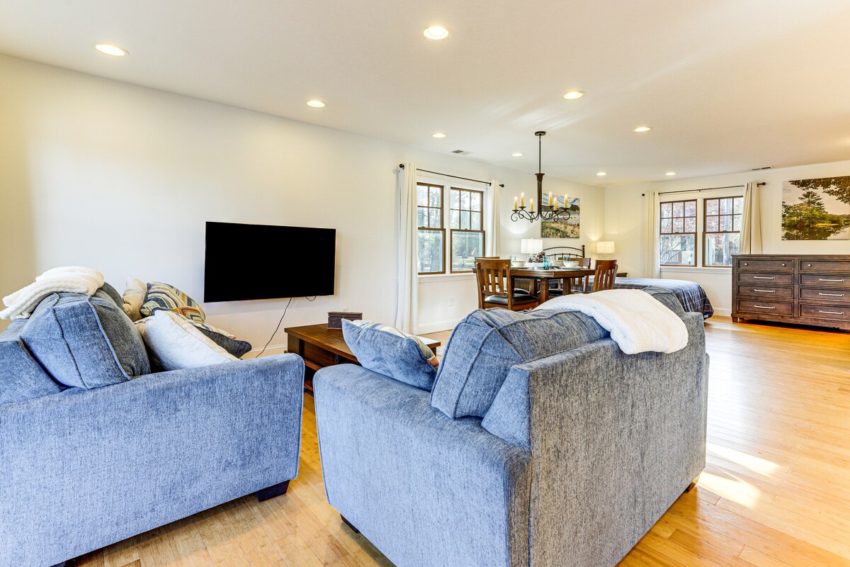मचान में झील के ऊपर सुबह सूरज तक जागें, या दो पीछे के बेडरूम में से एक में सूरज के बाद उठें। बार के ऊपर से झील के नज़ारे का आनंद लेते हुए सुबह की कॉफ़ी या चाय का आनंद लें और हंस, बाल्ड ईगल्स और ब्लू हेरन्स देखें। पगडंडियों पर पैदल यात्रा करने के बाद, झील को संरक्षण भूमि में कायाकिंग करें, या डॉक से मछली पकड़ने के बाद, गर्म पानी के टब में आराम करें। जैसे ही सूरज पेड़ों पर एक अच्छी किताब के साथ सोफे पर आलिंगन करता है और उल्लू के लिए एक कान बाहर रखता है।