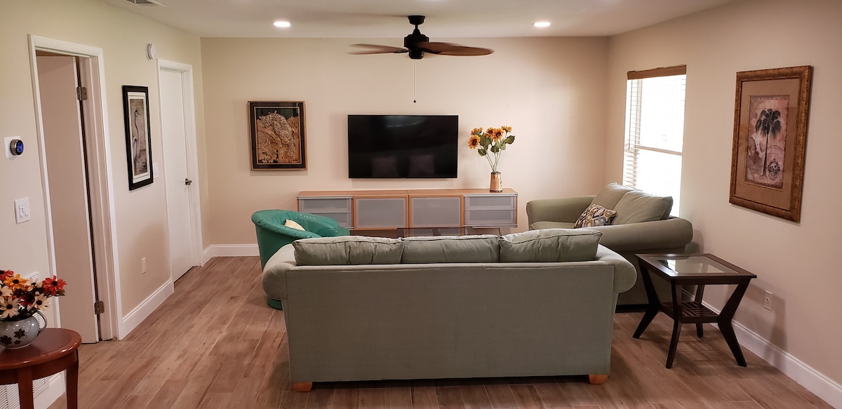 ★King size bed. ★ Dedicated work space ★High Speed WIFI. ★ Stone fireplace ★Air purifier. ★ LG 60" tv ★Turn on LG tv pressing the control red buttom then press " Home button" (house shaped) to access apps and LG Live TV channels. Perfect for Winter & Seasonal Stays (Jan–March) Ocala’s horse show-snowbirds-professionals seeking a quiet-fully furnished home Frequently we get wild hogs and wild turkeys crossings. Enjoy view from the back porch.