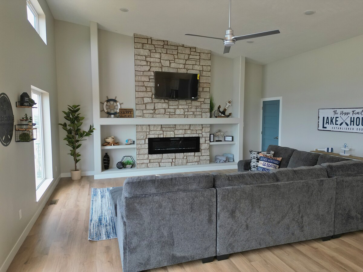 The Hideout on Ridgeway, a peaceful escape tucked away in nature yet close to everything you came for. 5 minutes to Gavin’s Boat Ramp on Lewis & Clark Lake, this spacious retreat is perfect for lake days, family gatherings and weekends with friends. Sip your coffee on the screened-in porch, cozy up by the fireplace, or settle in for movie night on the 75” TV in the loft. The home is fully stocked—linens, coffee, and cooking essentials are all provided—so you can arrive, unpack, and relax.